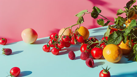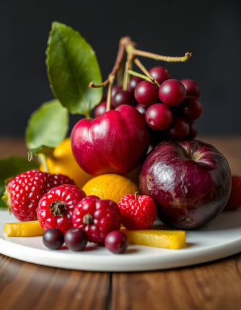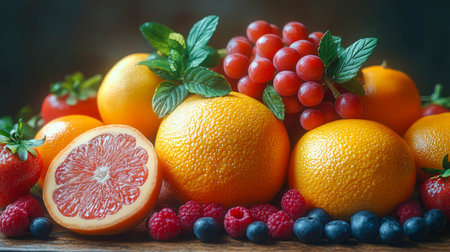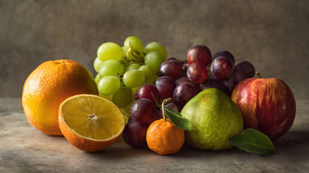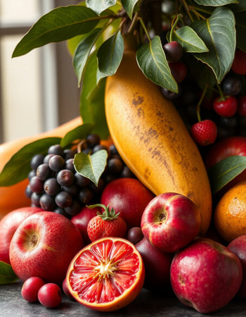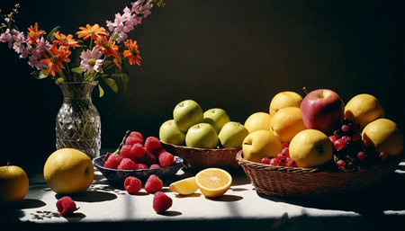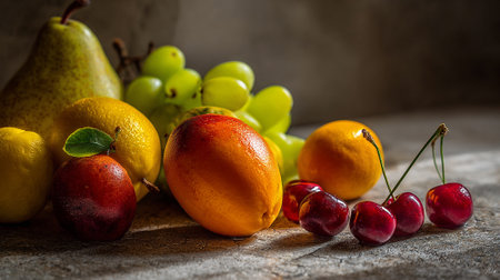 A colorful still life of fresh fruits arranged in warm lighting, creating a bold and inviting composition.