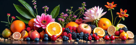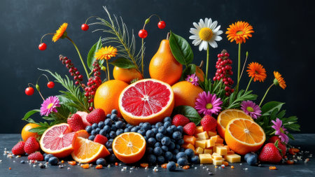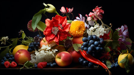 Vibrant display of fresh fruits and colorful flowers on dark background. That the image is generated using AI.