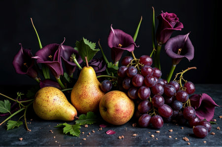 Elegant composition of pears, grapes, and purple calla lilies on dark background. That the image is generated using AI.