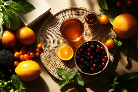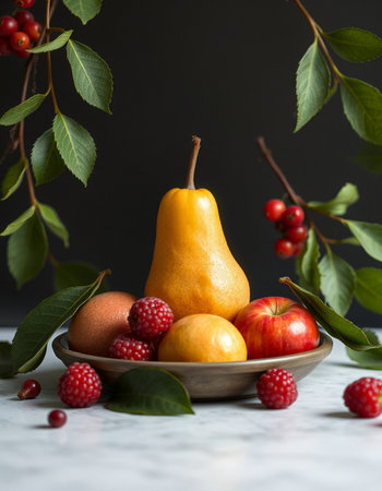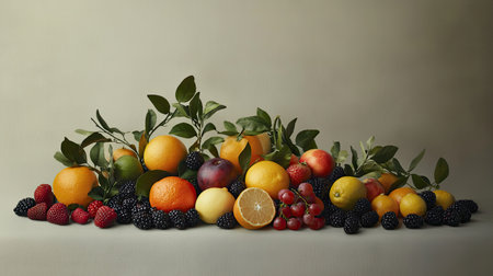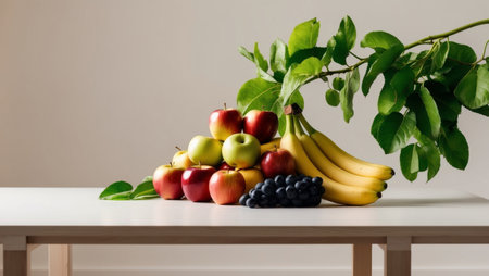 AI Generated. A pile of fruit on a table next to a leafy green branch