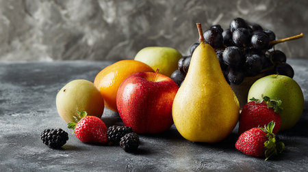 Still life with fresh fruits on grey background. Selective focus.
