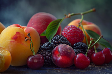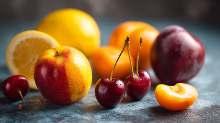 A variety of fruits including cherries, plums, and peaches are displayed on a table