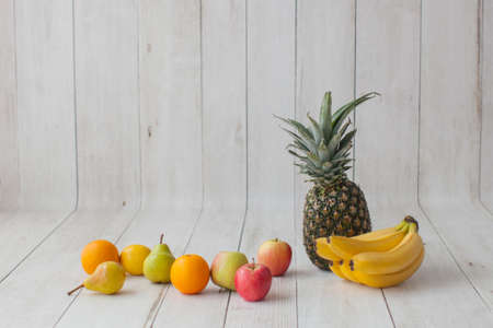 Fresh fruits on a white wooden table. Selective focus.