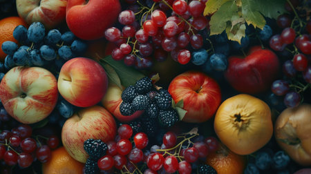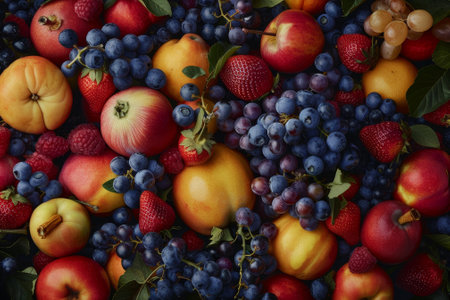 A close up of a variety of fruits including apples, grapes, and strawberries. Concept of abundance and freshness, with the fruits arranged in a visually appealing manner