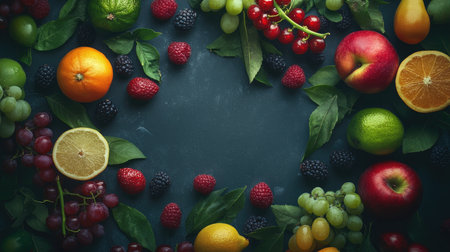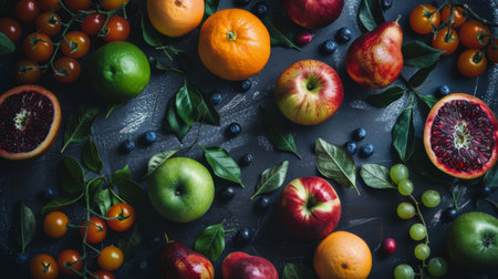 Top view of a variety of fresh fruits including apples, oranges, and berries on a dark rustic surface, creating a vibrant display.