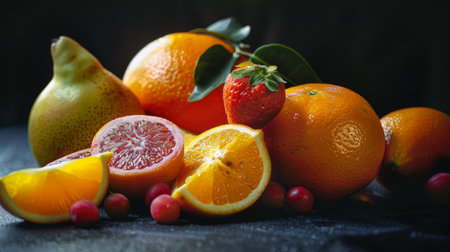A still life composition of citrus fruits and a pear on a dark background, highlighting the vibrant colors and textures of the fresh produce.