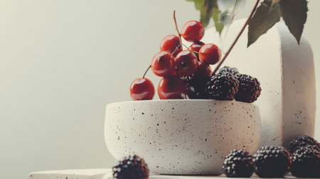 A minimalist composition featuring a white speckled bowl filled with blackberries and cherries, placed on a soft textured backdrop. Ideal for themes of food styling, minimalism, and still life photography.