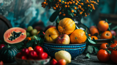 A bowl of assorted fruits including oranges, apples, and papaya, set in a rustic environment with rich colors and dramatic moody lighting.