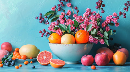 Artistic arrangement of citrus fruits like oranges and grapefruits, accompanied by pink flowers in a bowl on a turquoise background.