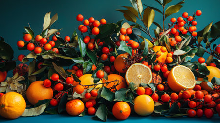 A colorful still life composition of assorted citrus fruits, berries, and lush green leaves, arranged against a rich teal background.