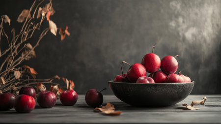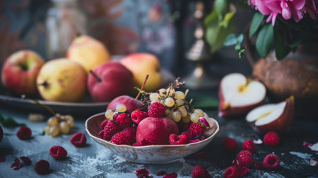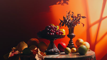 Dark baroque renaissance style still life photography of fruit and flowers