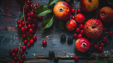 A colorful arrangement of fresh apples, ripe berries, and green leaves displayed on a rustic wooden surface