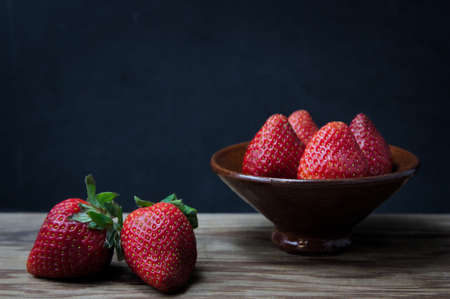 Some strawberries in a bowl with dark background and wooden table, dark food style with copy space
