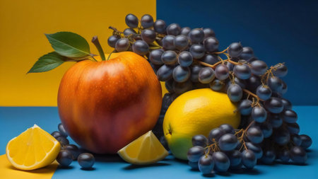 Still life with fruits on a blue and yellow background. Selective focus. generative ai