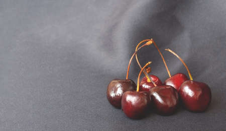 Ripe cherries with water drops on a gray background. Banner with red berries.Copy space.