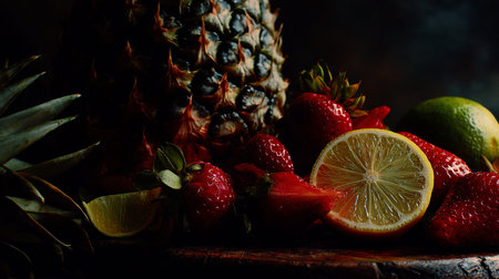 Strawberry, lime and pineapple on a wooden table. Dark background.