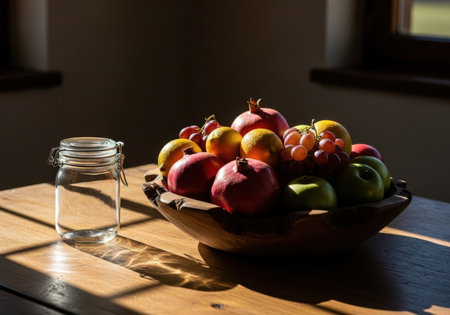 A rustic wooden table bathed in warm sunlight holds a bowl overflowing with ripe fruits and a clear glass jar filled with water.
