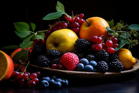Fruits and berries in a wooden bowl on a black background.