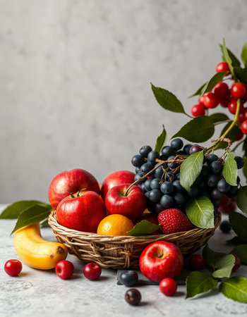 Fresh fruits and berries in a basket on a gray concrete background.