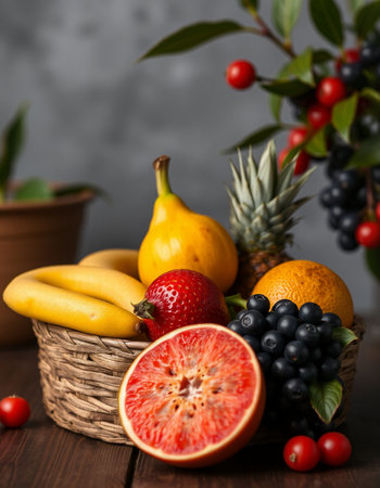 Variety of fresh fruits and berries in a basket on wooden background