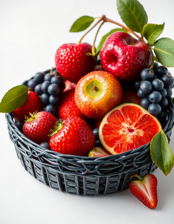Fresh fruit in a basket on a white background. Selective focus.