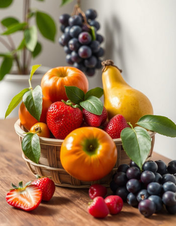 A bountiful basket filled with fresh grapes, apples, and other fruits, illuminated by soft natural light, evoking abundance.