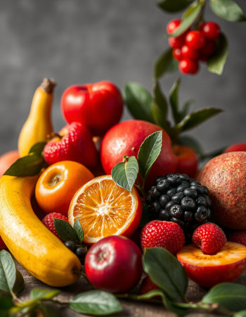 A vibrant arrangement of assorted fresh fruits, showcasing vivid colors and textures. Ideal for health and nutrition-themed projects and culinary displays.