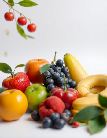 An AI generated illustration of bunch of different berries with green leaves