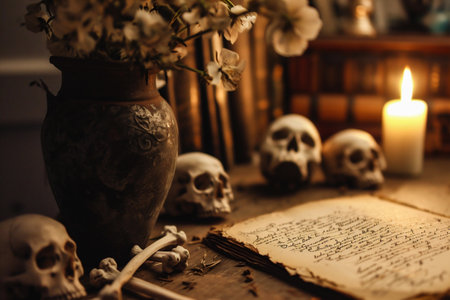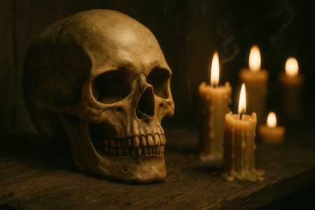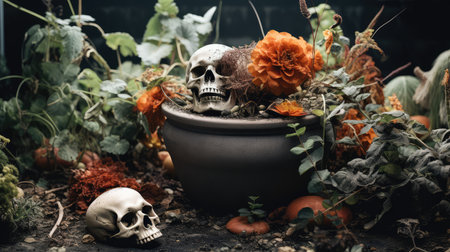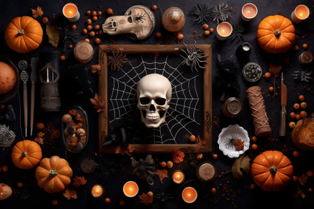 Halloween decorations with skulls and candles, created with Generative AI technology.