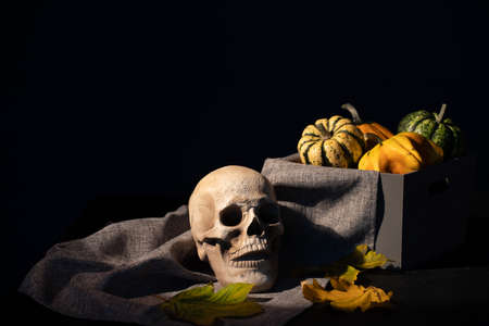 Halloween still life with human skull, pumpkins and dry leaves on black background