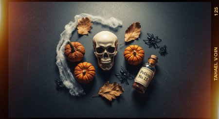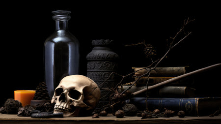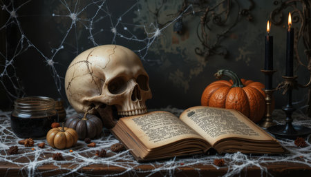 A ritual halloween witchcraft scene with candles, herbs, spider web, vintage bottles on the rustic background with a scary skull face and antique book