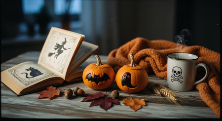 Halloween still life with pumpkins, cup of coffee, book and autumn leaves