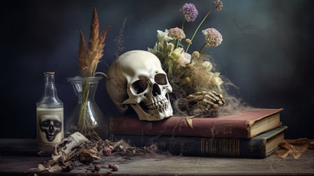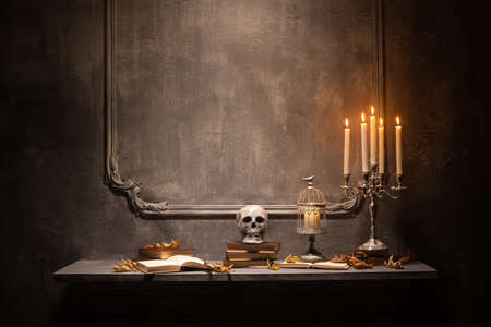 Mystical Halloween still-life background. Skull, candlestick with candles. Generative Ai