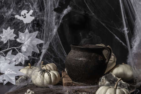 Halloween holiday. Festive composition with witch's pot, pumpkins, bat, ghost, spiders, and cobwebs. Light smoke, black-white tones, festive spirit