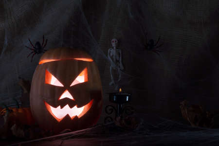 Ominous glowing jack head on background with spider web, skeleton and candle