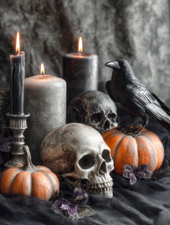 An moody Halloween tableau featuring weathered skulls, flickering candles, a perched crow atop pumpkins, and shadowy floral accents against a textured dark fabric ba
