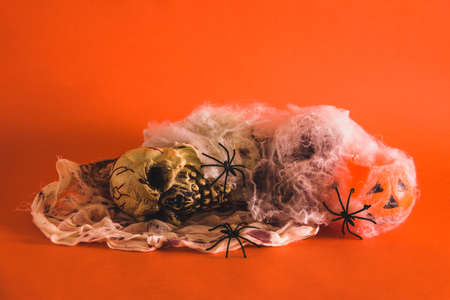 Halloween still life with skeleton pumpkins and spiders. Selective focus. Copy space.