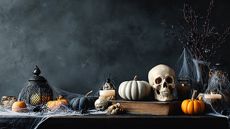 A dark Halloween-themed table arrangement with pumpkins, a skull, candles, and spider webs. The scene is moody and festive, perfect for autumn celebrations.
