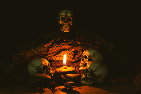 Scary skull set in low light candle use in halloween or mystery concept