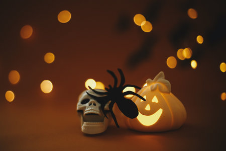 Atmospheric Halloween background. Pumpkins, glowing jack o lantern, skull, spider decoration on dark orange background with magical lights and flying black bats. Happy Halloween. Trick or treat