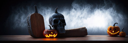 Halloween party set up props. White and black skulls with Jack O'Lantern pumpkin. Death symbol. Fear and horror concept. Dia de los Muertos and Halloween. Dark themed copy space