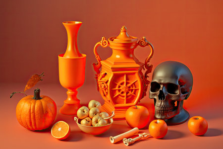 Decorations for Halloween set against a bright orange backdrop. Small scale still life. Generative AI