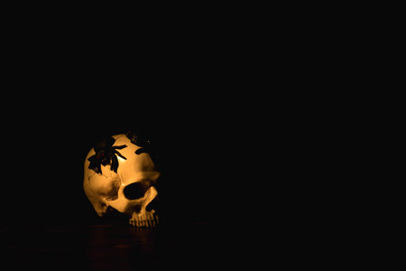 Halloween, spider on top human skull in front of black background