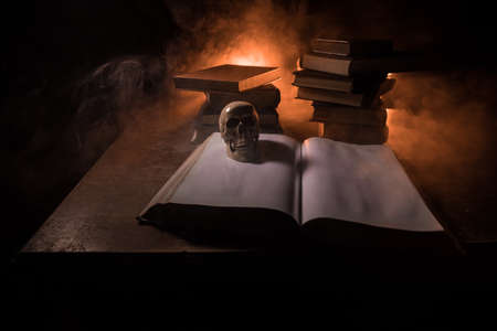 Skulls and old book on the table. Halloween concept.