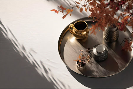 top view of chinese beautiful brass teapot teacup on gray tray with brown bouquet on tablecloth in sunlight leaf shadow with space calm relaxation for food drink background 3d