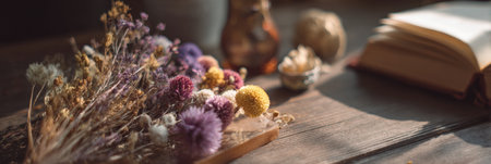 Brightly colored dried flowers are displayed on a rustic wooden table with an open book and various decorative objects, offering a warm and inviting ambiance.