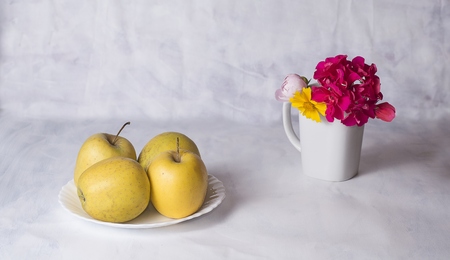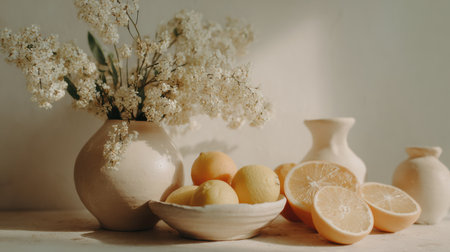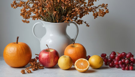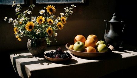 A simple provincial still life with fruits and flowers on a wooden table with natural light. AI generated.