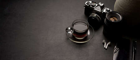 Top view of dark concept office desk with camera, decorations and copy space on black table