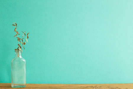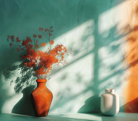 Sunlight dances on a teal wall, casting shadows of dried flowers in a clay vase, creating a serene and contemplative scene. Perfect interior inspiration. Generated A.I.