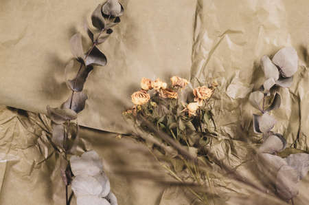 Fading flowers and eucalyptus branches. A bouquet of dying yellow roses against a brown background. selective focus.